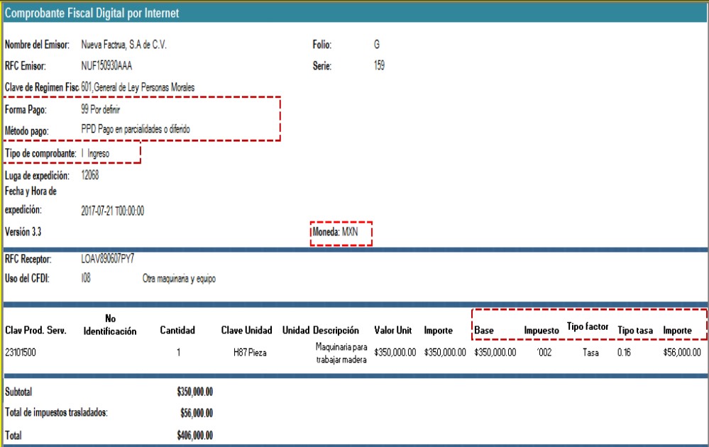 La empresa “Nueva Factura, S.A. de C.V.”, con RFC NUF150930AAA el 21 de julio de 2017 vende y entrega una maquinaria con un valor de $350,000.00 más IVA, la cual pacta con su cliente que le realice el pago el 10 de septiembre de 2017.