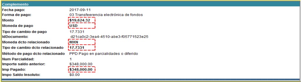 El 11 de septiembre de 2017 el cliente realiza el pago de la factura con una transferencia electrónica de fondos por un monto de 19,624.32 USD, con un tipo de cambio de 17.7331, lo cual equivale a los $300,000.00 más IVA que debía, este es el saldo después de descontar los $50,000.00 más IVA que ampara el CFDI de egresos por el descuento que se le otorgó por la falla de fábrica que tuvo la maquinaria.