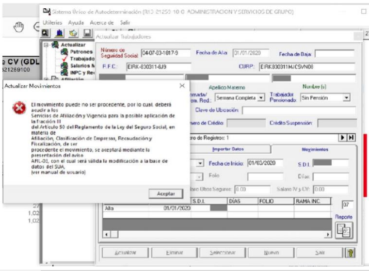 El movimiento puede no ser procedente por lo cual deberá acudir a los Servicios de Afiliación y Vigencia para la posible aplicación de fracción III del artículo 50 del Reglamento de la Ley del Seguro Social, en materia de Afiliación, Clasificación de Empresas, Recaudación y Fiscalización, de ser procedente el movimiento, se aceptará mediante la presentación del aviso AFIL-01 con el cual será cálida la modificación a la base de datos del SUA.